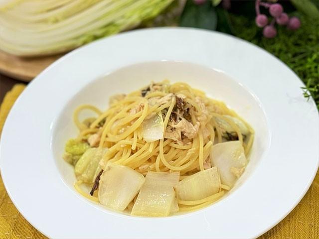 (4)フライパンにバターを入れて溶かし、スパゲッティの茹で汁と合わせ乳化させておく。ほぐしたツナと白菜を加えレモンを搾り入れてソースを仕上げる。