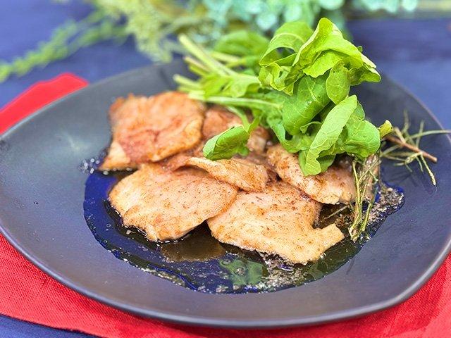 (2) フライパンでバターを溶かして鶏ムネ肉とローズマリーを入れて弱めの中火で鶏ムネ肉をソテーする。火が通ったら鶏ムネ肉とローズマリーを取り出し、フライパンに残ったバターにレモン汁を入れたら味を調えてレモンソースを仕上げる。