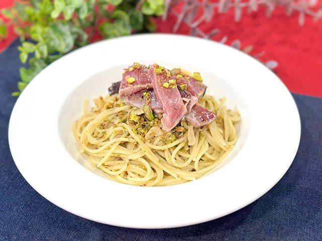 (5) ゆで上がったスパゲッティとソースを合わせて盛り付ける。味付けしたカツオを上に添えて、仕上げに取っておいた1/3の量のピスタチオをかける。