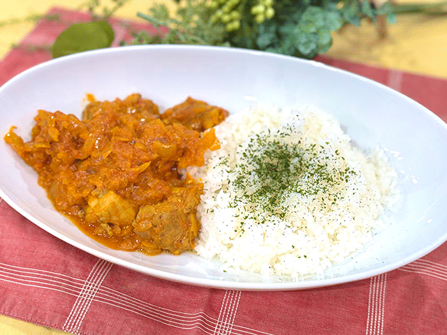 (4)鶏肉を取り出したフライパンにタマネギを入れて透き通るまで中火で炒める。おろしショウガ、おろしニンニクを加えて炒めたら【スパイス】を加えてさらに炒める。トマト缶を加えて1~2分炒めたらヨーグルト、塩(小さじ2/3)を加え鶏肉を戻し入れてフタをする。時々混ぜながら弱火で15分程煮込む。味を見て必要であれば塩で味を調える。