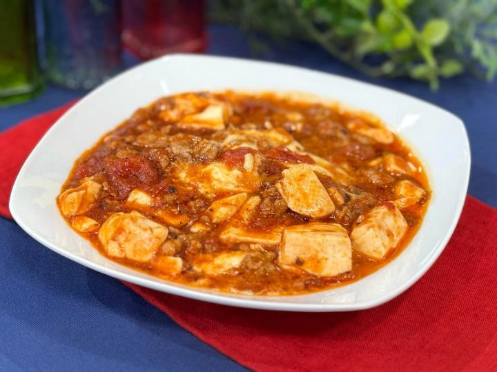 (4) 麻婆豆腐の素を加え、よく混ぜる。豆腐を加え煮立たせ、2分ほど煮込む。仕上げに食べやすい大きさにちぎったモッツァレラチーズを入れて、混ぜ合わせたら皿に盛り付ける。