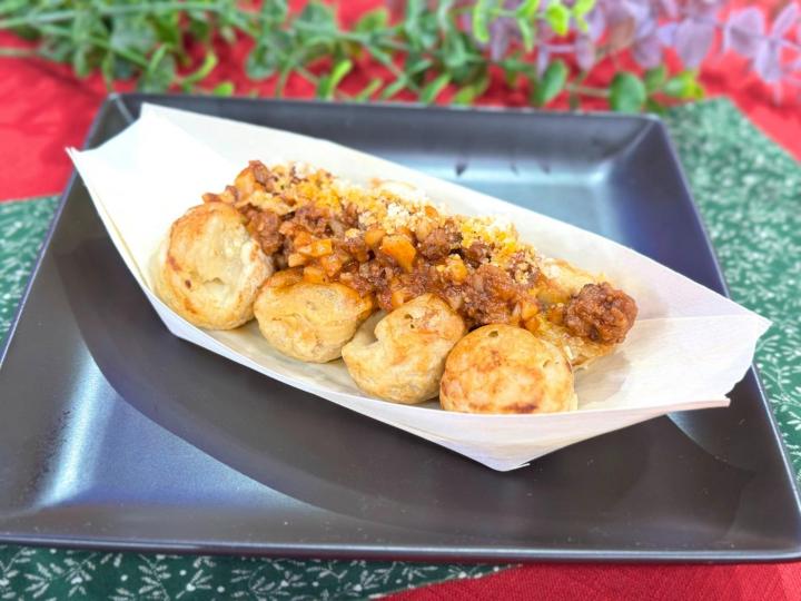 (3) 熱したタコ焼き鉄板の穴に半分ほど生地を流し入れて、そこへモッツァレラチーズを1つずつ入れる。続けて、穴の周りにあふれ出すくらいに生地を流し入れる。竹串を使いひっくり返して、途中転がしながら丸く焼く。