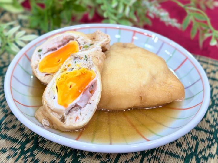 (4) 油揚げの袋の中の周りに引っ付けるようにあんを入れる。その際、卵が入るくらいの穴を空けて入れる。すべて入れ終わったら1個ずつ卵を穴に落として、袋口をつまようじでとめる。