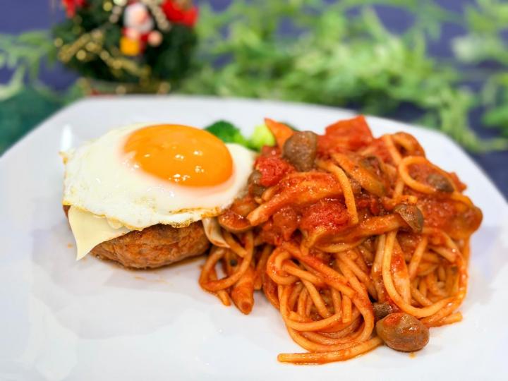 (3) スパゲッティの味、ゆで加減を確認したら、スパゲッティとハンバーグをお皿に盛り付ける。残ったソースを沸かして塩、コショウで味を調える。ソースをかけて、ハンバーグにチーズ、半熟の目玉焼きを作ってのせて、横にブロッコリーを飾る。