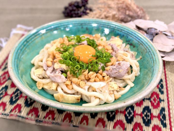 (4) 器に盛り付けたら天かすと青ネギを散らし、卵黄をのせる。