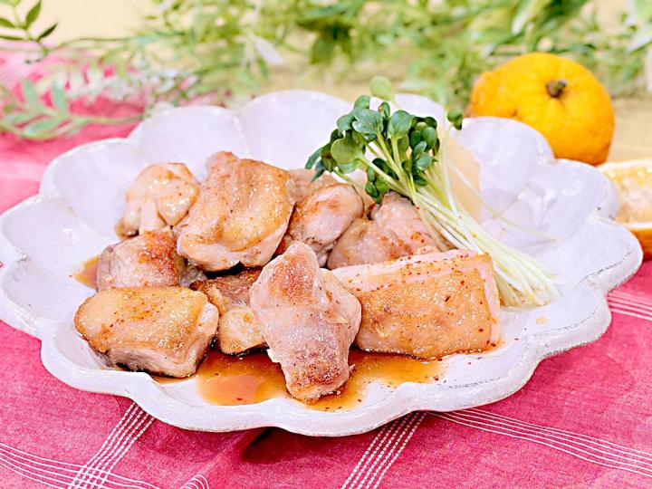 (3) 鶏肉は2~3cm角に切り、サラダ油を引いたフライパンで皮目から焼く。中火でじっくり10分ほど返しながら焼く。塩・こしょうをして皿に盛り付ける。