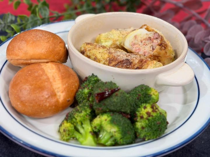 (5) ロールキャベツをオーブン皿にのせて、粉チーズ(適量)をかけたら周りにコンソメスープを流す。170℃に予熱したオーブンで約15分、ロールキャベツの中心が熱くなるまで加熱してカプネーを仕上げる。