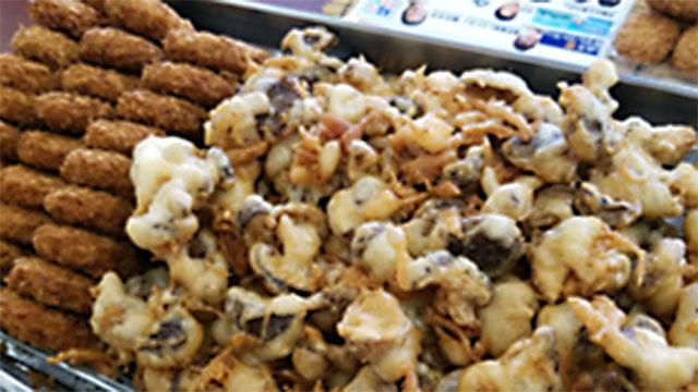 世羅町特産品の松きのこ天ぷら・コロッケ!試食ご用意してお待ちしています。
