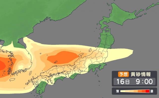 26.01.15(木) 黄砂に注意 あすは晴れて天気の崩れもなく、日中は15度超えて暖かい!・・・・とういうことは!!洗濯物が良く乾く!!!厚手のものも干したーい!!!ですが・・・(泣)黄砂が飛来します。濃度が濃いものが県内にもやってきますので洗濯物への付着も心配です。あすは室内干しをオススメします。また、この黄砂土曜にかけて飛来しますので、外出時にはマスクをする、室内の換気は必要最低限におさえるなど土曜にかけて対策をしていきましょう。気象予報士 田代香子 バックナンバー一覧へ カテゴリ 全て きょうのひとこと 天気 洗濯小ネタ weblog 空 自然 防災・災害への備え エコ・環境 バックナンバー 26.01.15(木) 黄砂に注意 26.01.13(火) お次の「寒波」は? 26.01.12(月) 「雪」マークは笑ってはいけない!? 26.01.09(金) 3連休の天気 26.01.08(木) あす朝は冷え込み強まる 26.01.05(月) 寒の入り 25.12.25(木) あすは北部山地を中心に大雪 25.12.23(火) 年末年始の気温は・・・ 25.12.22(月) 今日は「冬至」 25.12.19(金) 週末の天気 バックナンバー一覧 最新の天気 最新の天気概況 広島県の天気 現在の雨雲の様子(気象レーダー) 今後の雨雲の動き(降水短時間予報) 天気(今日・明日・週間) 予想気温 降水確率 波の高さと風 ポイント予報 雲の様子 天気図