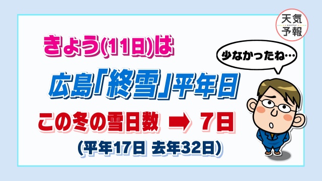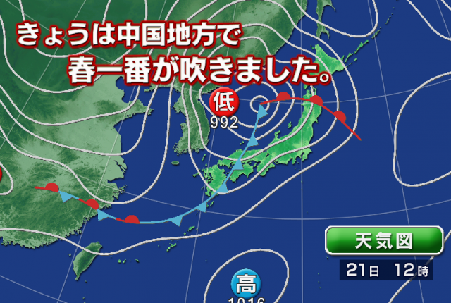 19.03.26(火) スギ、ヒノキ、サクラ・・・ 19.03.25(月) 「日替わり寒暖」まだ続く・・・ 19.03.22(金) 今夜は冷え込みます 19.03.21(木) あすは風冷たい 19.03.20(水) 暖かい「春分の日」に・・・ 19.03.19(火) 春本番をお楽しみください! 19.03.18(月) 今週は20度? 19.03.15(金) あすの朝にかけて天気の急変に注意 19.03.14(木) あすは急な雷雨に注意 19.03.13(水) スギ花粉の行方・・・ 19.03.12(火) 「冬」頑張っています 19.03.11(月) 雪が終わりの日? 19.03.08(金) 日曜日はまとまった雨のおそれ 19.03.07(木) あすは穏やかに晴れ 19.03.06(水) 季節の進みが「減速」 19.03.05(火) あすは「啓蟄」 19.03.04(月) 春雨いろいろ・・・ 19.03.01(金) あすからの週末は日曜雨 « 前の18件 9101112131415 次の18件 » 2025年 2024年 2023年 2022年 2021年 2020年 2019年 2018年 2017年 2016年 2015年 2014年 2013年 2012年 2011年 2010年 2009年 カテゴリ 全て きょうのひとこと 天気 洗濯小ネタ weblog 空 自然 防災・災害への備え エコ・環境 バックナンバー 25.12.12(金) 週末は雨具と防寒具を 25.12.11(木) あすは寒くなります 25.12.09(火) 「続く」「続かない」 25.12.08(月) 気になるなあ~ 次の寒波 25.12.05(金) 週末の天気 25.12.04(木) あすの朝も積雪&路面の凍結に注意 25.12.02(火) 県北は「積雪」の可能性あり! 25.12.01(月) 12月です・・・ 25.11.28(金) 週末の天気 25.11.27(木) あすにかけて黄砂に注意 バックナンバー一覧 最新の天気 最新の天気概況 広島県の天気 現在の雨雲の様子(気象レーダー) 今後の雨雲の動き(降水短時間予報) 天気(今日・明日・週間) 予想気温 降水確率 波の高さと風 ポイント予報 雲の様子 天気図