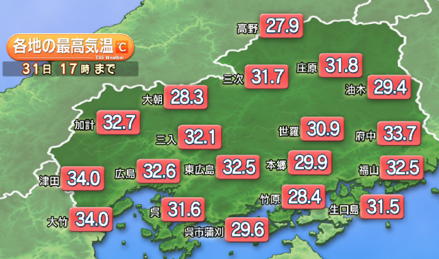廿日市津田や大竹では34度と今年一番の暑さとなりました。