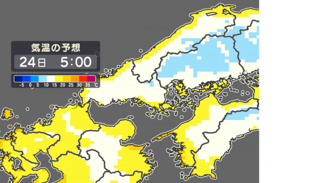 25.10.23(木) あすの朝も冷え込む 今夜からあすの朝にかけても広島県内は晴れて冷え込みが強まります。けさと同じくらいの冷え込みとなるでしょう。北部や内陸部では10度を下回り一部では5度以下のところも出てきますので暖かくしてお休みくださいね。日中は20度以上、25度近くまで上がるところもあって動くと汗ばむくらいのところも出てくるでしょう。朝晩と日中の気温差にも気をつけてくださいね。気象予報士 田代香子 バックナンバー一覧へ カテゴリ 全て きょうのひとこと 天気 洗濯小ネタ weblog 空 自然 防災・災害への備え エコ・環境 バックナンバー 25.10.23(木) あすの朝も冷え込む 25.10.21(火) これはスゴイ!?法則 25.10.20(月) 「ひとけた」の季節に・・・ 25.10.17(金) あすは雨具を 25.10.16(木) あすは衣替え日和 25.10.14(火) 下り階段が!! 25.10.13(月) スポーツの秋??? 25.10.10(金) 台風23号の動きに注意 25.10.09(木) あすもカラッとした暑さ 25.10.07(火) 明日は「寒露(かんろ)」 バックナンバー一覧 最新の天気 最新の天気概況 広島県の天気 現在の雨雲の様子(気象レーダー) 今後の雨雲の動き(降水短時間予報) 天気(今日・明日・週間) 予想気温 降水確率 波の高さと風 ポイント予報 雲の様子 天気図