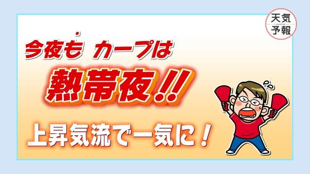 18.09.26(水) 今夜こそ! その2 今日も、同じことを書くことになるとは思っていませんでした・・・。 今夜こそ、カープファンの思いを! 朝晩は涼しい日が多くなりましたが、 今夜もカープファンの周辺は「熱帯夜」。 きっと熱気ムンムン 盛り上がることでしょう。 今夜こそ、上昇気流に乗って 一気に!! 気象予報士らしい?一言でしょ? ※台風24号の動きが大変気になってきました。 30日(日)には、西日本にかなり接近・上陸する恐れが出てきました。 台風が通過するコースによっては、広島県でも雨や風に警戒する必要が出てきます。 今後の台風24号の情報には、十分注意してほしいと思います。 気象予報士 山本 剛弘 バックナンバー一覧へ カテゴリ 全て きょうのひとこと 天気 洗濯小ネタ weblog 空 自然 防災・災害への備え エコ・環境 バックナンバー 25.12.12(金) 週末は雨具と防寒具を 25.12.11(木) あすは寒くなります 25.12.09(火) 「続く」「続かない」 25.12.08(月) 気になるなあ~ 次の寒波 25.12.05(金) 週末の天気 25.12.04(木) あすの朝も積雪&路面の凍結に注意 25.12.02(火) 県北は「積雪」の可能性あり! 25.12.01(月) 12月です・・・ 25.11.28(金) 週末の天気 25.11.27(木) あすにかけて黄砂に注意 バックナンバー一覧 最新の天気 最新の天気概況 広島県の天気 現在の雨雲の様子(気象レーダー) 今後の雨雲の動き(降水短時間予報) 天気(今日・明日・週間) 予想気温 降水確率 波の高さと風 ポイント予報 雲の様子 天気図