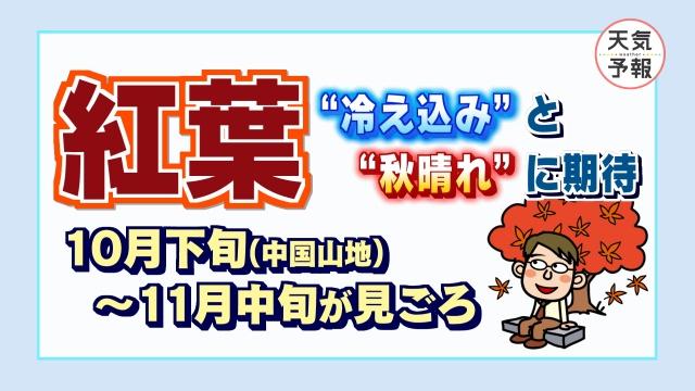 19.10.16(水) 紅葉シーズン近づく 今朝(16日)は、予想通り冷え込み、 広島県内各地で「この秋一番の冷え込み」になりました。 庄原市高野では 0.7度まで下がりました。 秋の深まりを感じます。 さて、この冷え込みが、紅葉を進めます。 すでに、中国山地では木々が色づき始めてきました。 この時期「秋晴れ」と「夜間の冷え込み」が多ければ多いほど、 きれいな紅葉になるといわれます。 紅葉の見ごろは、場所によって違いはありますが、 10月下旬の中国山地から始まり、11月中旬にかけて楽しめます。 今後の「秋晴れ」と「冷え込み」に期待したいですね! 気象予報士 山本 剛弘 バックナンバー一覧へ カテゴリ 全て きょうのひとこと 天気 洗濯小ネタ weblog 空 自然 防災・災害への備え エコ・環境 バックナンバー 25.12.12(金) 週末は雨具と防寒具を 25.12.11(木) あすは寒くなります 25.12.09(火) 「続く」「続かない」 25.12.08(月) 気になるなあ~ 次の寒波 25.12.05(金) 週末の天気 25.12.04(木) あすの朝も積雪&路面の凍結に注意 25.12.02(火) 県北は「積雪」の可能性あり! 25.12.01(月) 12月です・・・ 25.11.28(金) 週末の天気 25.11.27(木) あすにかけて黄砂に注意 バックナンバー一覧 最新の天気 最新の天気概況 広島県の天気 現在の雨雲の様子(気象レーダー) 今後の雨雲の動き(降水短時間予報) 天気(今日・明日・週間) 予想気温 降水確率 波の高さと風 ポイント予報 雲の様子 天気図