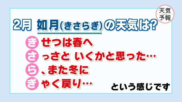 21.02.01(月) 2月の天気は? 今日から2月。 今日の雨はあまり冷たく感じず、 何となく「春」の訪れを感じるような雨でした。 さて、この2月はどんな天気変化になるのでしょう? 2月は 如月(きさらぎ)ともいいますので、 き・さ・ら・ぎ でまとめてみました。 きせつは春へ さっさといくかと思った ら、また冬に ぎゃく戻り・・・ ※ら の使い方がいいねえ~(苦笑) という感じになりそうです。 2月前半は、気温が高く「春」を感じるような日もありますが、 後半はまた気温が低くなって「冬」に逆戻りのような日も出てくると思います。 引き続き、気温の変動が大きいと思いますよ・・・。 気象予報士 山本 剛弘 バックナンバー一覧へ カテゴリ 全て きょうのひとこと 天気 洗濯小ネタ weblog 空 自然 防災・災害への備え エコ・環境 バックナンバー 25.12.12(金) 週末は雨具と防寒具を 25.12.11(木) あすは寒くなります 25.12.09(火) 「続く」「続かない」 25.12.08(月) 気になるなあ~ 次の寒波 25.12.05(金) 週末の天気 25.12.04(木) あすの朝も積雪&路面の凍結に注意 25.12.02(火) 県北は「積雪」の可能性あり! 25.12.01(月) 12月です・・・ 25.11.28(金) 週末の天気 25.11.27(木) あすにかけて黄砂に注意 バックナンバー一覧 最新の天気 最新の天気概況 広島県の天気 現在の雨雲の様子(気象レーダー) 今後の雨雲の動き(降水短時間予報) 天気(今日・明日・週間) 予想気温 降水確率 波の高さと風 ポイント予報 雲の様子 天気図