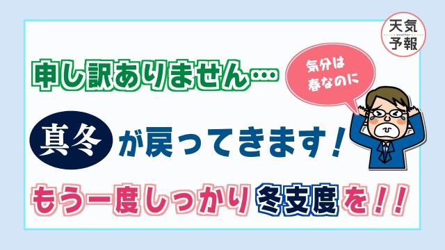 21.02.15(月) 「真冬」に逆戻り! きのう、今日と「春」本番のような陽気になりました。 今日の広島市の最高気温は4月上旬並みの18.0度でした。 しかし!! あすの夜以降、上空に非常に強い寒気が流れ込んできます。 17日(水)~18日(木)にかけては、広島県の上空にも 非常に強い寒気 が流れ込んで、冬型の気圧配置が強まります。 中国山地ではまとまった雪になり、 南部平野部でも雪が降る所が出てきます。 気温もかなり低くなり・・・ 真冬の天気 に逆戻りです。 もう、すっかり気分は「春」になってしまっていますが、 もう一度しっかり「冬支度?」をしておきましょう。 ※広島県では、本格的に「スギ花粉」の飛散が始まりました。 目がかゆい・・・ 気象予報士 山本 剛弘 バックナンバー一覧へ カテゴリ 全て きょうのひとこと 天気 洗濯小ネタ weblog 空 自然 防災・災害への備え エコ・環境 バックナンバー 25.12.12(金) 週末は雨具と防寒具を 25.12.11(木) あすは寒くなります 25.12.09(火) 「続く」「続かない」 25.12.08(月) 気になるなあ~ 次の寒波 25.12.05(金) 週末の天気 25.12.04(木) あすの朝も積雪&路面の凍結に注意 25.12.02(火) 県北は「積雪」の可能性あり! 25.12.01(月) 12月です・・・ 25.11.28(金) 週末の天気 25.11.27(木) あすにかけて黄砂に注意 バックナンバー一覧 最新の天気 最新の天気概況 広島県の天気 現在の雨雲の様子(気象レーダー) 今後の雨雲の動き(降水短時間予報) 天気(今日・明日・週間) 予想気温 降水確率 波の高さと風 ポイント予報 雲の様子 天気図