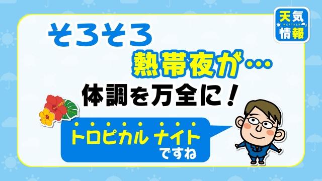 21.06.29(火) そろそろ熱帯夜? 広島市の週間予報の「予想最低気温」を見ると・・・ 向こう一週間 23度、24度 という数字が並びます。 夜間の気温が下がりにくくなってきます。 最低気温が25度以上ですと 「熱帯夜」・・・。 もうそんな時期が近づいてきたようです。 疲れをためないようにして、健康管理に気を付けて過ごしたいですね。 そして「熱帯夜」という言葉を聞くだけでモヤモヤ感があるので・・・ 今年もなるべく(できれば) 「トロピカル・ナイト」 と呼びたいと思います。 暑さ自体は変わりませんが、気分的には楽になりそうな気がします!? 気象予報士 山本 剛弘 バックナンバー一覧へ カテゴリ 全て きょうのひとこと 天気 洗濯小ネタ weblog 空 自然 防災・災害への備え エコ・環境 バックナンバー 25.12.12(金) 週末は雨具と防寒具を 25.12.11(木) あすは寒くなります 25.12.09(火) 「続く」「続かない」 25.12.08(月) 気になるなあ~ 次の寒波 25.12.05(金) 週末の天気 25.12.04(木) あすの朝も積雪&路面の凍結に注意 25.12.02(火) 県北は「積雪」の可能性あり! 25.12.01(月) 12月です・・・ 25.11.28(金) 週末の天気 25.11.27(木) あすにかけて黄砂に注意 バックナンバー一覧 最新の天気 最新の天気概況 広島県の天気 現在の雨雲の様子(気象レーダー) 今後の雨雲の動き(降水短時間予報) 天気(今日・明日・週間) 予想気温 降水確率 波の高さと風 ポイント予報 雲の様子 天気図
