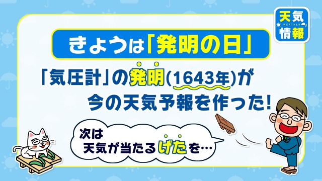 22.05.17(火) 楽しい上空の「うす雲」 22.05.16(月) あと何日晴れるかな? 22.05.11(水) 去年のお話しですが・・・ 22.05.10(火) 梅雨入りですか?? 22.05.09(月) 今週は「夕日」が見られない? 22.05.05(木) 今日から「夏」! 22.05.04(水) 沖縄「梅雨入り」・・・ 22.05.03(火) 「晴天」何日続くかな? 22.04.27(水) 冷え込み注意! 22.04.26(火) 昔の「春雨」は良かった・・・? 22.04.25(月) 大型連休の天気は?? 22.04.20(水) 早くも雨の季節?? 22.04.19(火) 恵みの「春雨」です 22.04.18(月) これを発明したい!? 22.04.13(水) 間もなく「戻ります」 22.04.12(火) 気温高めでカープも! 22.04.11(月) 早くも「初夏」へ・・・ 22.04.06(水) 半そで可!? « 前の18件 3456789 次の18件 » 2025年 2024年 2023年 2022年 2021年 2020年 2019年 2018年 2017年 2015年 2014年 2013年 2012年 2011年 2010年 2009年 カテゴリ 全て きょうのひとこと 天気 洗濯小ネタ weblog 空 自然 防災・災害への備え エコ・環境 バックナンバー 25.12.12(金) 週末は雨具と防寒具を 25.12.11(木) あすは寒くなります 25.12.09(火) 「続く」「続かない」 25.12.08(月) 気になるなあ~ 次の寒波 25.12.05(金) 週末の天気 25.12.04(木) あすの朝も積雪&路面の凍結に注意 25.12.02(火) 県北は「積雪」の可能性あり! 25.12.01(月) 12月です・・・ 25.11.28(金) 週末の天気 25.11.27(木) あすにかけて黄砂に注意 バックナンバー一覧 最新の天気 最新の天気概況 広島県の天気 現在の雨雲の様子(気象レーダー) 今後の雨雲の動き(降水短時間予報) 天気(今日・明日・週間) 予想気温 降水確率 波の高さと風 ポイント予報 雲の様子 天気図