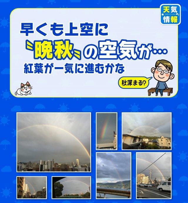 22.10.24(月) 晩秋の空気が・・・ 本題の前に・・・ 今日は、上空に寒気を伴った気圧の谷が進んできて、 広島県は不安定な天気になりました。 広島市内でも、雨が降ったり晴れたり・・・。 こんな時はもしかして!と思って空を見上げていたら・・・ 出ましたね!見事な虹が! もう4時か5時だったので2時(虹)は出ないと思っていましたが(笑)。 (虹で笑いをとる気象予報士・・・) さて、その上空の寒気が、かなり冷たい空気なのです。 「晩秋」の空気です。 これで、また季節が進み、秋が少し深まりそうです。 紅葉が一気に進みそうですね。 今週は朝晩冷え込む日が続きます。 気を付けてお過ごしください。 (昼間は過ごしやすいですよ!) 喜びと笑顔をお届けします。 気象(喜笑)予報士 山本 剛弘 バックナンバー一覧へ カテゴリ 全て きょうのひとこと 天気 洗濯小ネタ weblog 空 自然 防災・災害への備え エコ・環境 バックナンバー 25.12.12(金) 週末は雨具と防寒具を 25.12.11(木) あすは寒くなります 25.12.09(火) 「続く」「続かない」 25.12.08(月) 気になるなあ~ 次の寒波 25.12.05(金) 週末の天気 25.12.04(木) あすの朝も積雪&路面の凍結に注意 25.12.02(火) 県北は「積雪」の可能性あり! 25.12.01(月) 12月です・・・ 25.11.28(金) 週末の天気 25.11.27(木) あすにかけて黄砂に注意 バックナンバー一覧 最新の天気 最新の天気概況 広島県の天気 現在の雨雲の様子(気象レーダー) 今後の雨雲の動き(降水短時間予報) 天気(今日・明日・週間) 予想気温 降水確率 波の高さと風 ポイント予報 雲の様子 天気図