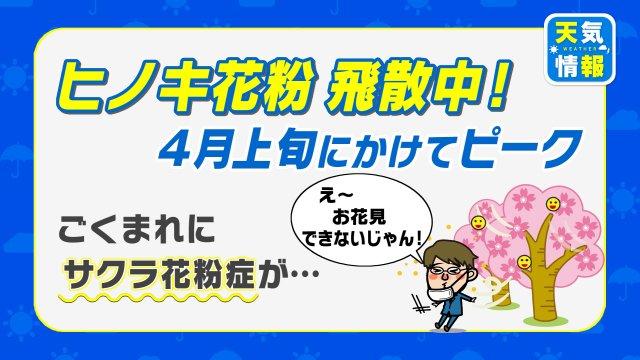 23.03.28(火) ヒノキ花粉がピーク 広島地方気象台は、今日広島の 「サクラ(ソメイヨシノ)満開」 を発表しました。 そんなニュースを聞くだけで、気分が明るくなりますね。 しかし、例年サクラが満開の頃が ヒノキ花粉飛散のピークになります・・・。 今年も、その通りになりました。 これから4月上旬にかけて 「ヒノキ花粉の飛散ピーク期」 になります。 スギ花粉に比べると「短期集中型」ですが、 今が一番警戒時期です。 ヒノキ花粉症の方は、しっかり対策をして過ごしていきましょう。 そして・・・ ごくごく稀(まれ)にですが、 サクラの花粉でアレルギー反応を起こしてしまう場合もあるそうです。 「サクラ花粉症」ですね・・・。 明日もお花見日和が続きますが、朝晩は冷え込みますので、 夜桜を楽しむ方は、服装に十分ご注意ください! 喜びと笑顔をお届けします。 気象(喜笑)予報士 山本 剛弘 バックナンバー一覧へ カテゴリ 全て きょうのひとこと 天気 洗濯小ネタ weblog 空 自然 防災・災害への備え エコ・環境 バックナンバー 25.12.12(金) 週末は雨具と防寒具を 25.12.11(木) あすは寒くなります 25.12.09(火) 「続く」「続かない」 25.12.08(月) 気になるなあ~ 次の寒波 25.12.05(金) 週末の天気 25.12.04(木) あすの朝も積雪&路面の凍結に注意 25.12.02(火) 県北は「積雪」の可能性あり! 25.12.01(月) 12月です・・・ 25.11.28(金) 週末の天気 25.11.27(木) あすにかけて黄砂に注意 バックナンバー一覧 最新の天気 最新の天気概況 広島県の天気 現在の雨雲の様子(気象レーダー) 今後の雨雲の動き(降水短時間予報) 天気(今日・明日・週間) 予想気温 降水確率 波の高さと風 ポイント予報 雲の様子 天気図