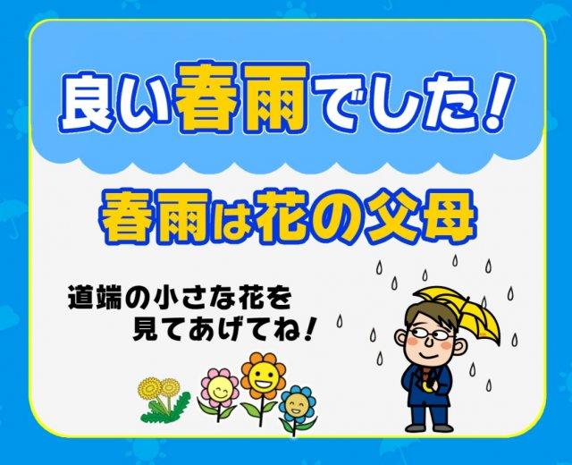 24.04.09(火) 良い春雨でした!? 今日のお昼前、雨上がりの直後に、 天満川の遊歩道にあるサクラを見に行ってきました。 時折吹く強い風で、「桜吹雪」状態になっていました。 そして地面の水たまりには、サクラの花びらがプカプカ浮いていて、 子どもちが喜んで見ていました。 散り始めたサクラですが、まだまだいろいろ楽しめます! さて、昨日から今朝にかけての雨、サクラにとっては嬉しくなかったかもしれませんが、 植物全般でみると、良い雨だったと思います。 この時期の雨は、植物にとっては恵みの雨です。 春雨は花の父母 ついサクラを見上げて「上」ばかり見てしまいますが、 道端の小さなお花たちもたくさん咲き始めています。 「咲いてま~~す!」 と「下」の方からもお花たちの声が聞こえてきているような気がします。 小さなお花たちも、見てあげて下さいね。 喜びと笑顔をお届けします。 気象(喜笑)予報士 山本 剛弘 バックナンバー一覧へ カテゴリ 全て きょうのひとこと 天気 洗濯小ネタ weblog 空 自然 防災・災害への備え エコ・環境 バックナンバー 25.12.12(金) 週末は雨具と防寒具を 25.12.11(木) あすは寒くなります 25.12.09(火) 「続く」「続かない」 25.12.08(月) 気になるなあ~ 次の寒波 25.12.05(金) 週末の天気 25.12.04(木) あすの朝も積雪&路面の凍結に注意 25.12.02(火) 県北は「積雪」の可能性あり! 25.12.01(月) 12月です・・・ 25.11.28(金) 週末の天気 25.11.27(木) あすにかけて黄砂に注意 バックナンバー一覧 最新の天気 最新の天気概況 広島県の天気 現在の雨雲の様子(気象レーダー) 今後の雨雲の動き(降水短時間予報) 天気(今日・明日・週間) 予想気温 降水確率 波の高さと風 ポイント予報 雲の様子 天気図