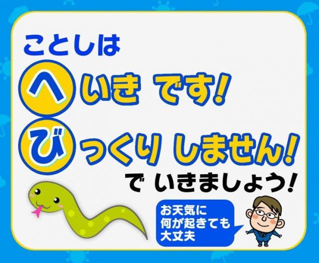 25.01.06(月) 今年は へ・び でいきましょう! あけましておめでとうございます。 今年もよろしくお願いします。 年末年始は寒かったですが、広島では荒れた天気になることもなく、 少しほっとしました。 初日の出も見ることができた方が多かったのではないでしょうか? さて、今年2025年は「へび年」。 そこで今年は・・・ へいき(平気)です! びっくりしません! の へ・び でいきましょう! お天気に、いつ何が起きても対応できるように、 気象情報を常に聞くようにして、 「何か」ありそうなときは早めに対策をしておく・・・ これで行きましょう! 気象現象はコントロールすることはできませんが、 それに対応する行動は、何でもできるはずです。 災害のない、災害にあわない一年にしていきたいですね。 今年も残すところあと359日(笑)。早いですね!? 今年も一日一日を大切に過ごしていきたいですね。 喜びと笑顔をお届けします。 気象(喜笑)予報士 山本 剛弘 バックナンバー一覧へ カテゴリ 全て きょうのひとこと 天気 洗濯小ネタ weblog 空 自然 防災・災害への備え エコ・環境 バックナンバー 25.12.12(金) 週末は雨具と防寒具を 25.12.11(木) あすは寒くなります 25.12.09(火) 「続く」「続かない」 25.12.08(月) 気になるなあ~ 次の寒波 25.12.05(金) 週末の天気 25.12.04(木) あすの朝も積雪&路面の凍結に注意 25.12.02(火) 県北は「積雪」の可能性あり! 25.12.01(月) 12月です・・・ 25.11.28(金) 週末の天気 25.11.27(木) あすにかけて黄砂に注意 バックナンバー一覧 最新の天気 最新の天気概況 広島県の天気 現在の雨雲の様子(気象レーダー) 今後の雨雲の動き(降水短時間予報) 天気(今日・明日・週間) 予想気温 降水確率 波の高さと風 ポイント予報 雲の様子 天気図