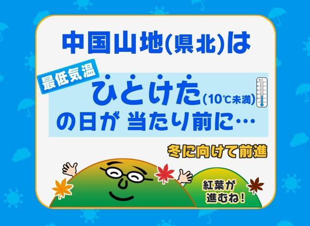 25.10.20(月) 「ひとけた」の季節に・・・ ようやく「暑い」という言葉を聞かなくなりました。鍋料理を食べて「熱い」という言葉は増えたかもしれませんが・・・。秋らしい気温になりましたね。ずいぶん涼しく感じましたが、それでもまだ今日は平年より2~5度も高い気温でした。これまで、いかに気温が高かったかがよくわかります。日本列島の上空にかなり冷たい空気が流れ込み、今日は北海道で雪が降った所もありました。北日本はもう「冬」です・・・。北日本の秋は、相当短かっただろうなあ・・・。広島県でも、これから県北・中国山地では朝の気温が「ひとけた」=10度未満になる日も当たり前になります。「夏」が長かっただけに、まだ体が(気持ちも)ついていけませんが、今後気温の変化に十分ご注意下さい!ただ、この冷え込みで「紅葉」が一気に進むと思います。猛暑の影響があるかもしれませんが、きれいな紅葉を期待したいですね!喜びと笑顔をお届けします。気象(喜笑)予報士 山本 剛弘 バックナンバー一覧へ カテゴリ 全て きょうのひとこと 天気 洗濯小ネタ weblog 空 自然 防災・災害への備え エコ・環境 バックナンバー 25.10.20(月) 「ひとけた」の季節に・・・ 25.10.17(金) あすは雨具を 25.10.16(木) あすは衣替え日和 25.10.14(火) 下り階段が!! 25.10.13(月) スポーツの秋??? 25.10.10(金) 台風23号の動きに注意 25.10.09(木) あすもカラッとした暑さ 25.10.07(火) 明日は「寒露(かんろ)」 25.10.06(月) 今夜は「中秋の名月」 25.10.03(金) あすにかけて雨の降り方に注意 バックナンバー一覧 最新の天気 最新の天気概況 広島県の天気 現在の雨雲の様子(気象レーダー) 今後の雨雲の動き(降水短時間予報) 天気(今日・明日・週間) 予想気温 降水確率 波の高さと風 ポイント予報 雲の様子 天気図