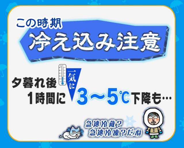25.11.04(火) 急速冷凍? 日に日に秋が深まっていくのを感じます。今朝(4日朝)は中国山地で「氷点下」の冷え込みの所もありました。 北広島町大朝 -1.3度 神石高原町油木 -1.1度 庄原市高野 -0.6度「冬日」になりました。その他の地点でも、今シーズン一番の冷え込みの所が多かったです。昨夜はよく晴れて、放射冷却現象で、冷え込みました。気温が下がり始めたのは、昨日の夕暮れ後から。1時間に3度くらいのペースで下がった所もありました。この時期、晴れていると、夕暮れ後から急速に気温が下がるのが当たり前です。特に午後5時~8時くらいの時間帯は、1時間に3~5度位のペースで一気に下がることもあります。ちょっと外で立ち話でもしている間に・・・「寒い!」なんていうこともあるかも知れませんね。秋の夕暮れは「急速冷蔵」いや「急速冷凍」状態になります。十分ご注意下さい。私(山本)の「つまらないひとこと」も同じような効果があると良く言われます・・・(苦笑)。反省・・・喜びと笑顔をお届けします。気象(喜笑)予報士 山本 剛弘 バックナンバー一覧へ カテゴリ 全て きょうのひとこと 天気 洗濯小ネタ weblog 空 自然 防災・災害への備え エコ・環境 バックナンバー 25.11.04(火) 急速冷凍? 25.11.03(月) あと3日・・・ 25.10.31(金) 3連休の天気 25.10.30(木) あすは雨具が活躍 25.10.28(火) 「寒い」「寒い」 25.10.27(月) 激動の10月でした 25.10.24(金) 週末は雨具を 25.10.23(木) あすの朝も冷え込む 25.10.21(火) これはスゴイ!?法則 25.10.20(月) 「ひとけた」の季節に・・・ バックナンバー一覧 最新の天気 最新の天気概況 広島県の天気 現在の雨雲の様子(気象レーダー) 今後の雨雲の動き(降水短時間予報) 天気(今日・明日・週間) 予想気温 降水確率 波の高さと風 ポイント予報 雲の様子 天気図
