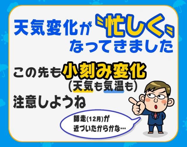25.11.25(火) 忙しくなってきました 今日は、朝から不安定で非常に変わりやすい天気になりましたね。雨が降ったと思ったら晴れてきて、また雨がザーッと・・・。予想通りではありましたが、天気に振り回された一日でした・・・。この先も、しばらくは天気が小刻みに変わる見込みです。天気マークでは表現できない位の「小刻み変化」もありそうです。天気も気温もです・・・。天気変化が忙しくなったのは・・・12月・師走が近づいたからかな?何かと忙しくなる時期ですが、体調を崩さないように、笑顔で過ごしたいですね。喜びと笑顔をお届けします。気象(喜笑)予報士 山本 剛弘 バックナンバー一覧へ カテゴリ 全て きょうのひとこと 天気 洗濯小ネタ weblog 空 自然 防災・災害への備え エコ・環境 バックナンバー 25.11.25(火) 忙しくなってきました 25.11.24(月) よくある質問 25.11.21(金) 3連休の天気 25.11.20(木) 乾燥続く 25.11.18(火) 木枯らしに・・・ 25.11.17(月) 一気にやってきます! 25.11.14(金) 週末の天気 25.11.13(木) あすは日差しが戻ります 25.11.10(月) 「冬」は突然に・・・ 25.11.07(金) 週末の天気 バックナンバー一覧 最新の天気 最新の天気概況 広島県の天気 現在の雨雲の様子(気象レーダー) 今後の雨雲の動き(降水短時間予報) 天気(今日・明日・週間) 予想気温 降水確率 波の高さと風 ポイント予報 雲の様子 天気図