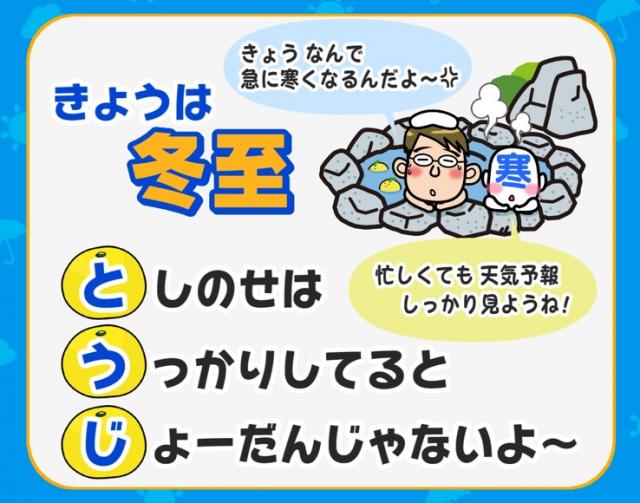 25.12.22(月) 今日は「冬至」 今日は「冬至(とうじ)」でした。ご存じの通り、一年で一番「昼間」の長さが短い日でした。だからと言って、特に何かが起きるわけではありませんが・・・。今年のカレンダーを見ると、もう「最後の2行目」になりましたね。来週は、もう「新年」を迎えます。年の瀬で、何かとお忙しい方も多いと思います。そこで、一句?? としのせは うっかりしてると じょうだんじゃないよ~忙しくて、天気予報の確認を忘れると・・・「冗談じゃないよ~、今日雨降るって言ってたっけ」とか「何でこんな急に寒くなるんだよ~」とか・・・そんなことが起きます。今日は気温が高めで過ごしやすかったですが、24日(水)は雨。そしてその後は寒気が流れ込んで、週末にかけて気温が低くなります。この先、天気も気温も変化が大きくなりますので、忙しくても、しっかり天気予報をチェックしてほしいと思います!喜びと笑顔をお届けします。気象(喜笑)予報士 山本 剛弘 バックナンバー一覧へ カテゴリ 全て きょうのひとこと 天気 洗濯小ネタ weblog 空 自然 防災・災害への備え エコ・環境 バックナンバー 25.12.22(月) 今日は「冬至」 25.12.19(金) 週末の天気 25.12.18(木) あすも日中は晴れて過ごしやすい 25.12.16(火) さんた 25.12.15(月) おさえて、おさえて・・・ 25.12.12(金) 週末は雨具と防寒具を 25.12.11(木) あすは寒くなります 25.12.09(火) 「続く」「続かない」 25.12.08(月) 気になるなあ~ 次の寒波 25.12.05(金) 週末の天気 バックナンバー一覧 最新の天気 最新の天気概況 広島県の天気 現在の雨雲の様子(気象レーダー) 今後の雨雲の動き(降水短時間予報) 天気(今日・明日・週間) 予想気温 降水確率 波の高さと風 ポイント予報 雲の様子 天気図