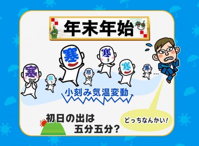 25.12.23(火) 年末年始の気温は・・・ 「サンタさんが来たよ~」と早くも喜んでいたお子様がいましたが、あわてんぼうのサンタクロース ですかね。今日は まだ23日。いや、もう23日 と言った方がいいかな。今年もあと8日となりました。広島の年末年始は基本的には「寒い」ですが、その寒さも強まったり弱まったり、けっこう小刻みに気温変動しそうです。特に今週末は、一時的に寒さが厳しくなります。そしてもう一つ気になるのが「初日の出」。今のところ、大晦日、元日の天気が「流動的」でありまして・・・見ることができるかどうかは今日の時点では「五分五分」ということにしておきたいです。どっちなんかい!と言われそうですが、なんかい(何回)聞かれても今日の時点では「五分五分」です・・・。私(山本)のこのブログは今日が今年最後です。次は1月5日の予定です。みなさま、年末年始お元気で無事故でお過ごしください。良いお年をお迎えください!いつもブログをみていただきまして、ありがとうございます。喜びと笑顔をお届けします。気象(喜笑)予報士 山本 剛弘 バックナンバー一覧へ カテゴリ 全て きょうのひとこと 天気 洗濯小ネタ weblog 空 自然 防災・災害への備え エコ・環境 バックナンバー 25.12.23(火) 年末年始の気温は・・・ 25.12.22(月) 今日は「冬至」 25.12.19(金) 週末の天気 25.12.18(木) あすも日中は晴れて過ごしやすい 25.12.16(火) さんた 25.12.15(月) おさえて、おさえて・・・ 25.12.12(金) 週末は雨具と防寒具を 25.12.11(木) あすは寒くなります 25.12.09(火) 「続く」「続かない」 25.12.08(月) 気になるなあ~ 次の寒波 バックナンバー一覧 最新の天気 最新の天気概況 広島県の天気 現在の雨雲の様子(気象レーダー) 今後の雨雲の動き(降水短時間予報) 天気(今日・明日・週間) 予想気温 降水確率 波の高さと風 ポイント予報 雲の様子 天気図