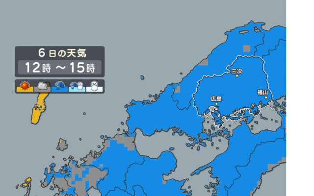15.03.20(金) サクラ、サク!! 12.04.06(金) 縮景園夜桜特別開園 うつくしや うつくしや! 12.04.02(月) ようやく広島の標本木にも春が… 12.03.30(金) サクラ、サク!! 12.03.28(水) 広島のサクラの開花は!? “つぼみ、さらに…" 12.03.26(月) いつ、咲くかなぁ… 10.04.05(月) サクラが見頃になりました! 2015年 2012年 2010年 カテゴリ 全て きょうのひとこと 天気 洗濯小ネタ weblog 空 自然 防災・災害への備え エコ・環境 バックナンバー 26.03.05(木) あすは雨 26.03.03(火) 3月はぎっしり・・・ 26.03.02(月) 完全に「春」の天気ですね! 26.02.27(金) 週末の天気 26.02.26(木) あすは雨具を 26.02.24(火) 「春雨」のシーズン 26.02.23(月) 雨時々・・・ 26.02.20(金) 3連休の天気 26.02.19(木) あすの天気 26.02.17(火) まだ来るの?? バックナンバー一覧 最新の天気 最新の天気概況 広島県の天気 現在の雨雲の様子(気象レーダー) 今後の雨雲の動き(降水短時間予報) 天気(今日・明日・週間) 予想気温 降水確率 波の高さと風 ポイント予報 雲の様子 天気図