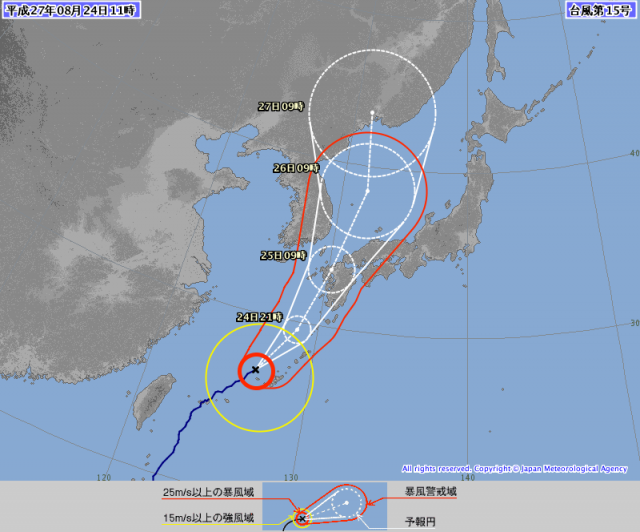 15.08.24(月) 台風15号の動向に注意(続報) 非常に強い台風15号、 23日夜には石垣島で最大瞬間風速71.0メートルと猛烈な風を吹かせました… このあとさほど弱まらず、東シナ海からあす九州~中国地方西部を通過する見込みです。 "だいぶわかってきたけど、まだよくわからん”というのが正直なところ。 まだ予報円も大きくて、不確定要素が大きいですねぇ (気象庁HPより) 台風の特徴は ・台風の構造が非常にコンパクト ・台風本体の雨雲は発達 中心に近いところでは風も非常に強そう ・接近直前までは雨、風ともにあまり強くないかもしれないが 近づくと急に強まるおそれ ・また台風が東寄りの進路(広島県に近いところ)を通ると、 雨風の影響が予想以上に強まるおそれも うーむ… 最接近 あす25日火曜お昼前後か昼過ぎ~夕方 注意点 大雨・短時間の非常に激しい雨 強風、高波 大雨 短時間の激しい雨 きょう夕方辺りからはにわか雨のところも出てきそう またあす明け方前からさらに雨が降りやすくなりそう。 特にあす午前中から夕方前にかけては雨が激しく降るおそれがあります 河川の増水やはんらん、洪水、低地浸水などに警戒を 土砂災害にも念の為に注意を 強風、高波、高潮 あす未明には台風の強風域に入りそう。 現状、予報円の中心に近いところを通れば暴風域には入らないのですが 瞬間的には25~30メートルぐらいの非常に強い風が吹くおそれもあります 強風と沿岸部の高波、夕方満潮時の高潮には念のため注意を なお台風が東寄りの広島県に近いところを通ると、 影響が長引くとともに、さらなる大雨と暴風のおそれが 今後の情報には十分注意するとともに ・きょうのうちに家の周りの飛びやすいものはかたづけ ・雨どいや排水口など、水回りの掃除をしておきましょう ・また最接近時には安全な場所で過ごしましょう!! 家の2階や高いビルの上層階など高いところ(洪水、浸水対策)や 頑丈な建物のなか(風対策)で過ごすようにしましょう!! なお、台風のスピードが変わったり、 進路が東寄りの広島県に近いところを通ると、予想や影響が大幅に変わるおそれがあります。 なお、最新情報は TSS天気予報ホームページ TSS天気予報Twitter(公式) 両方をチェックしてください!! (hadaken) バックナンバー一覧へ カテゴリ 全て きょうのひとこと 天気 洗濯小ネタ weblog 空 自然 防災・災害への備え エコ・環境 バックナンバー 25.12.12(金) 週末は雨具と防寒具を 25.12.11(木) あすは寒くなります 25.12.09(火) 「続く」「続かない」 25.12.08(月) 気になるなあ~ 次の寒波 25.12.05(金) 週末の天気 25.12.04(木) あすの朝も積雪&路面の凍結に注意 25.12.02(火) 県北は「積雪」の可能性あり! 25.12.01(月) 12月です・・・ 25.11.28(金) 週末の天気 25.11.27(木) あすにかけて黄砂に注意 バックナンバー一覧 最新の天気 最新の天気概況 広島県の天気 現在の雨雲の様子(気象レーダー) 今後の雨雲の動き(降水短時間予報) 天気(今日・明日・週間) 予想気温 降水確率 波の高さと風 ポイント予報 雲の様子 天気図