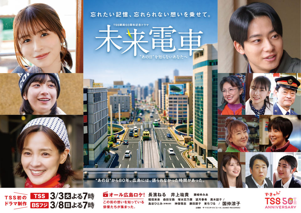 テレビ新広島が開局50周年を記念し、BSフジと共同制作・放送したドラマ『未来電車“あの日”を知らないあなたへ』が3月8日(日)午後9時より、民放公式テレビ配信サービス「TVer(ティーバー)」にて配信を開始した。あわせて、ドラマ制作の舞台裏を描いた30分のドキュメンタリー番組も配信中で、期間限定で無料見放題となる。