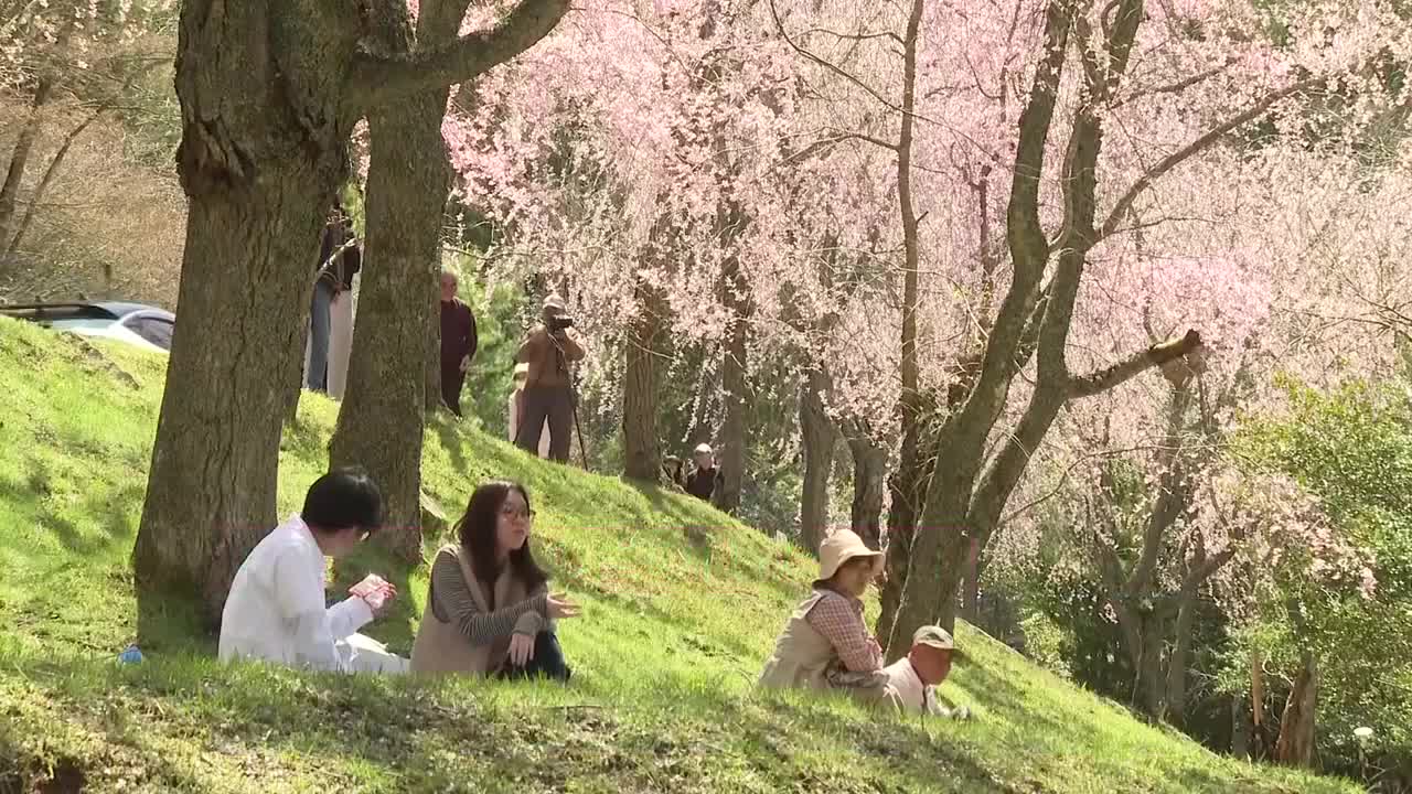 ピンク色のカーテンの下でのんびり散歩 250本のしだれ桜見頃 広島・世羅町