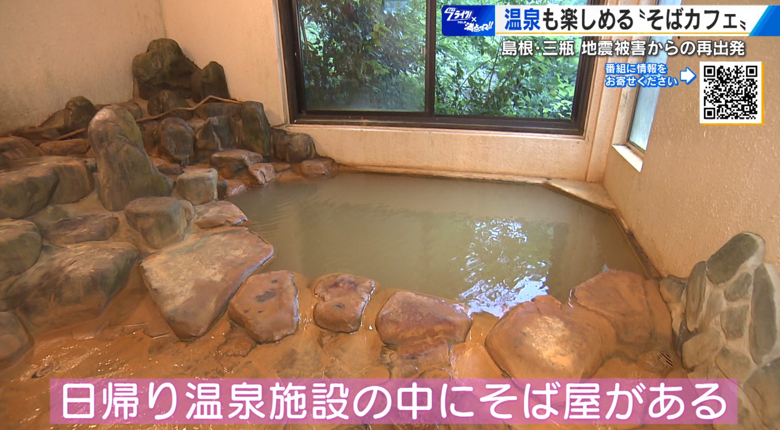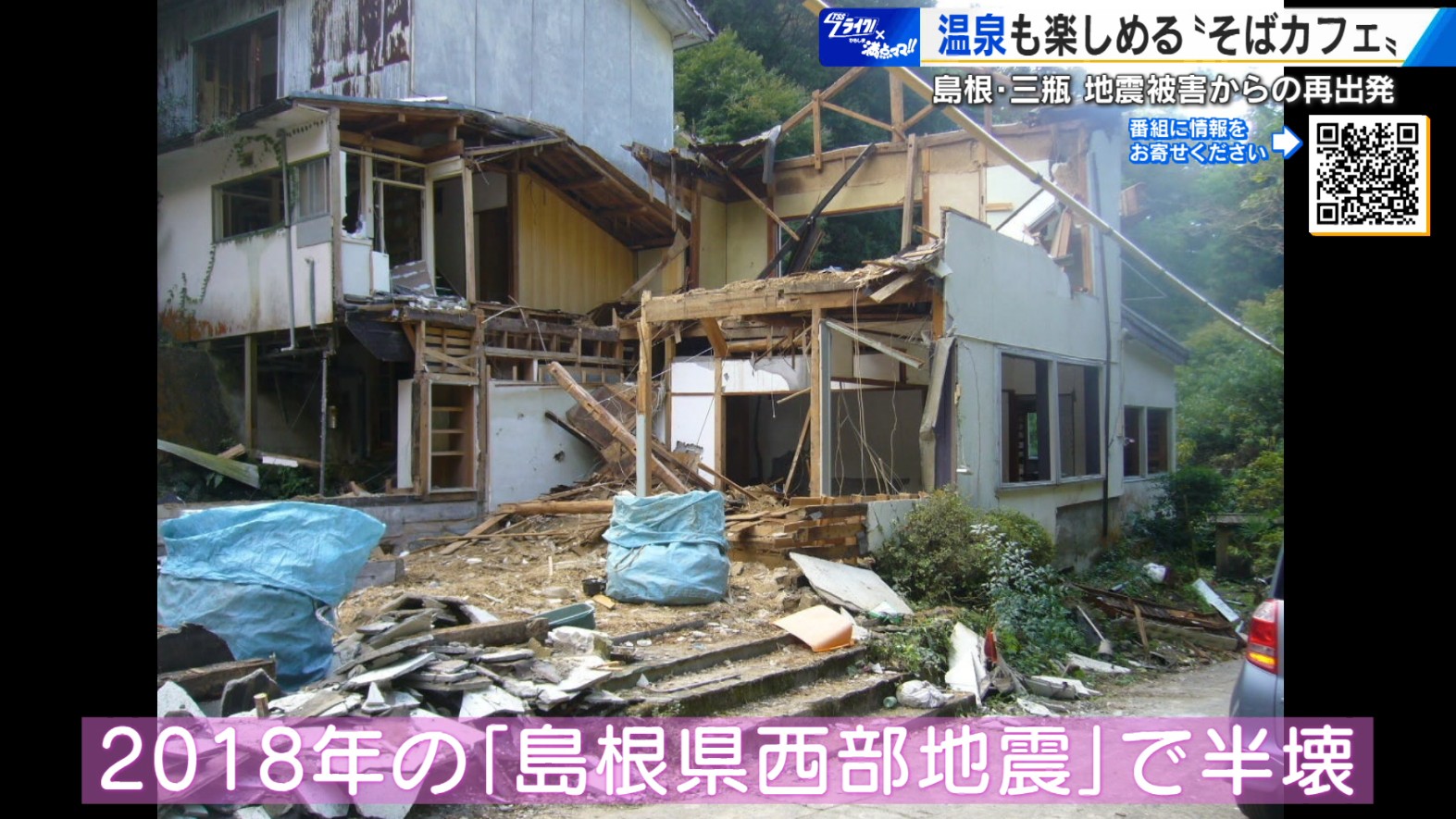 2018年の島根県西部地震。これで半壊しちゃって、いろいろ悩んだんですけど、温泉の管だけは傷まず、地震の被害あってなかったので、もうここでやっぱりやった方がいいよねっていうことで、日帰り温泉とおそば屋という併設した施設にしましょうということで。