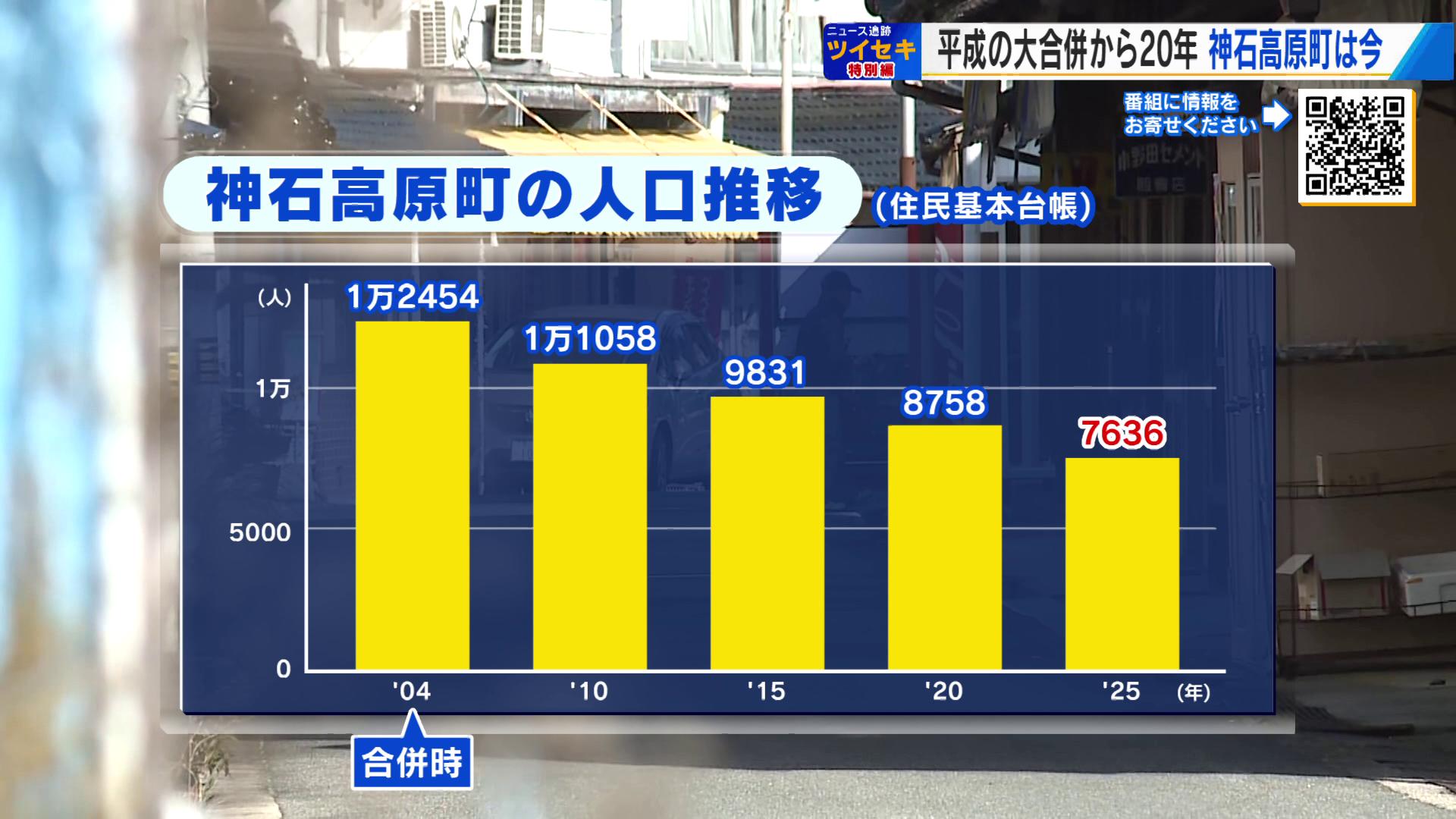 合併当時、1万2000人あまりいた人口はおよそ7600人にまで減少しました。