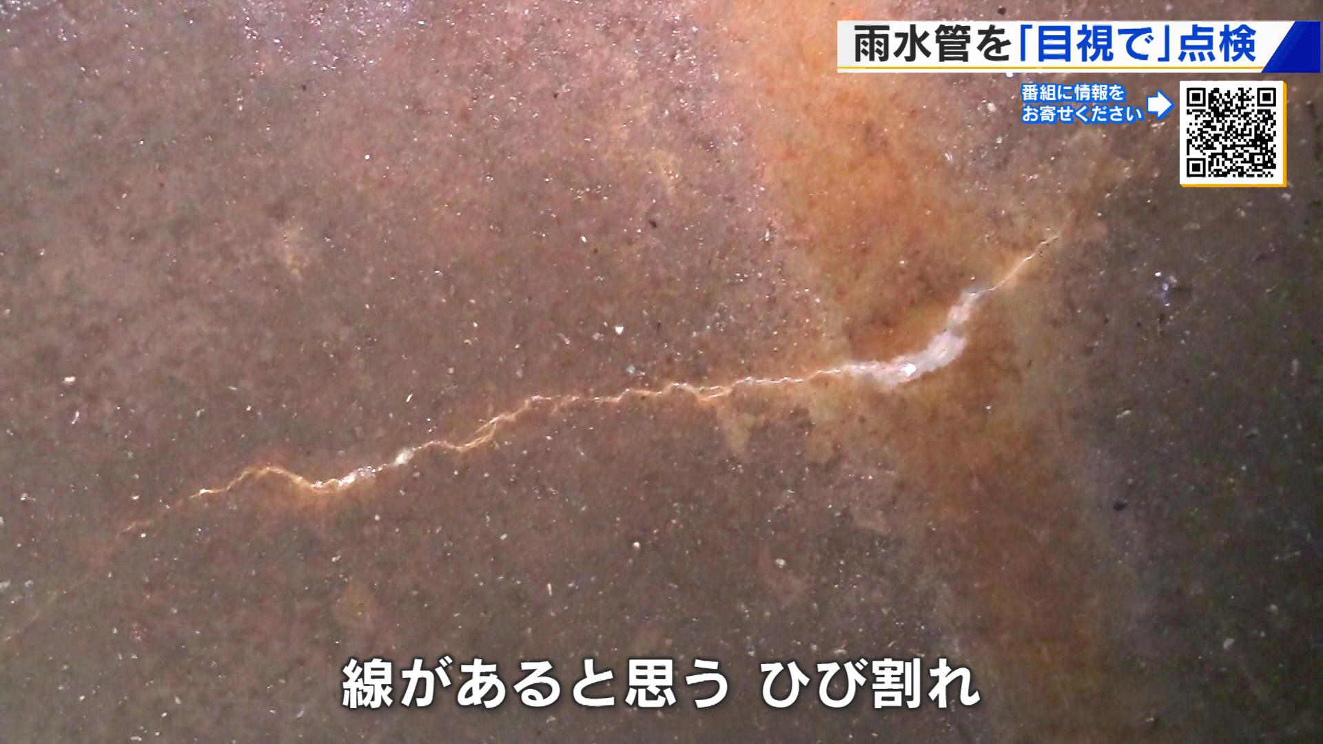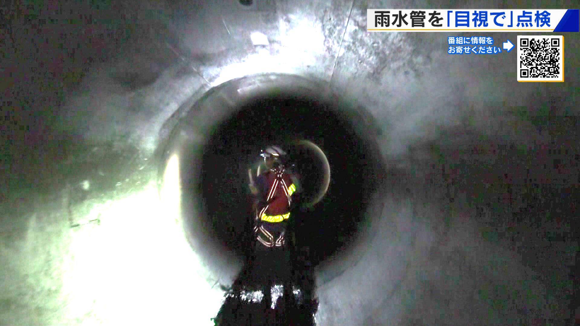 「直径2.6メートルある雨水管にいます。いま職員が目視でこの雨水管にヒビや腐食がないか確認をしています」