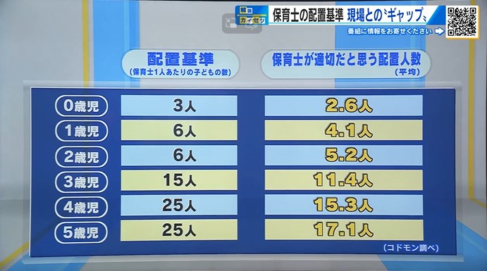 一方で、民間企業の調査では保育士自身が適切だと思う配置人数はすべての年齢で国の配置基準を下回る結果となっています。