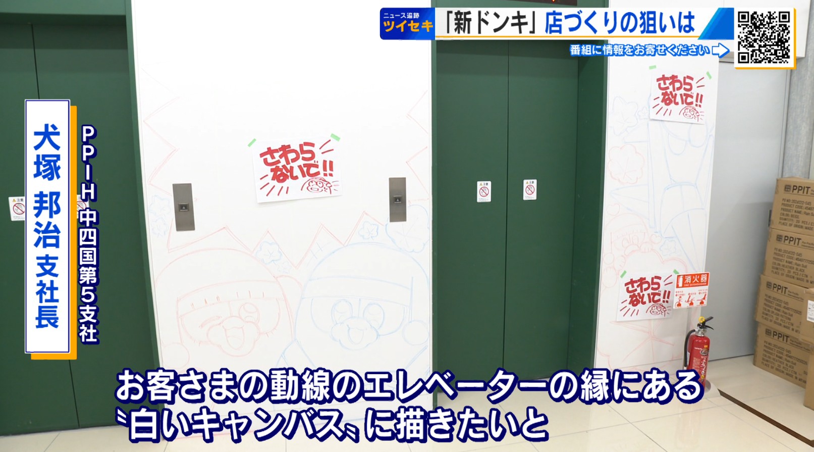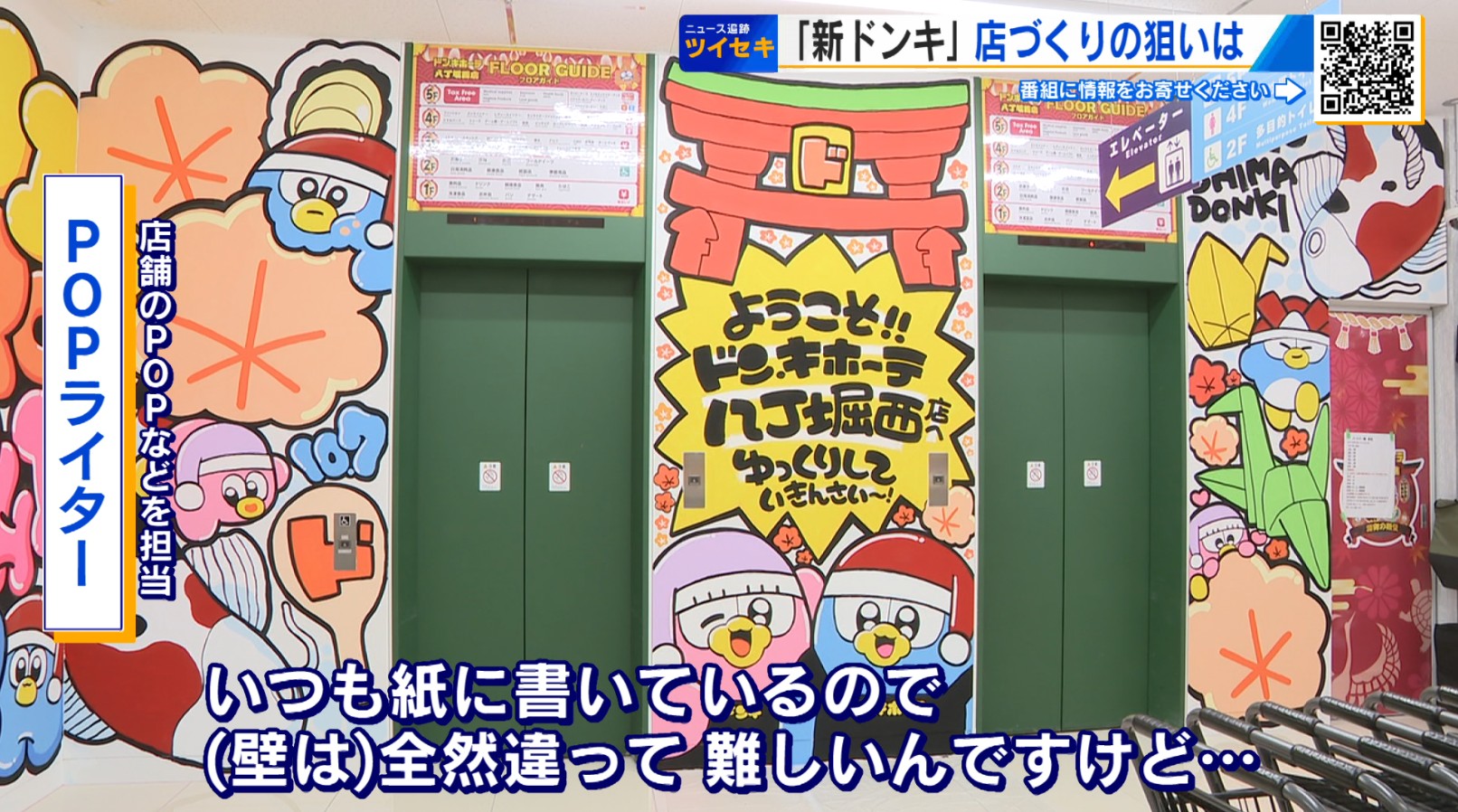 「これ、実はいま下書きっぽく書いているが、お客様の動線のエレベーターのふちにあるこういった白いキャンバスに描きたいと、POPライターさんが自発的に言ってくれて、それはすごくいいじゃないかということで計画を進めてきた」