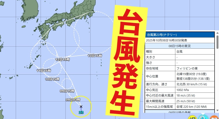 8日、日本のすぐ南にある非常に強い勢力の22号に次いで、フィリピンの東で23号が発生しました。