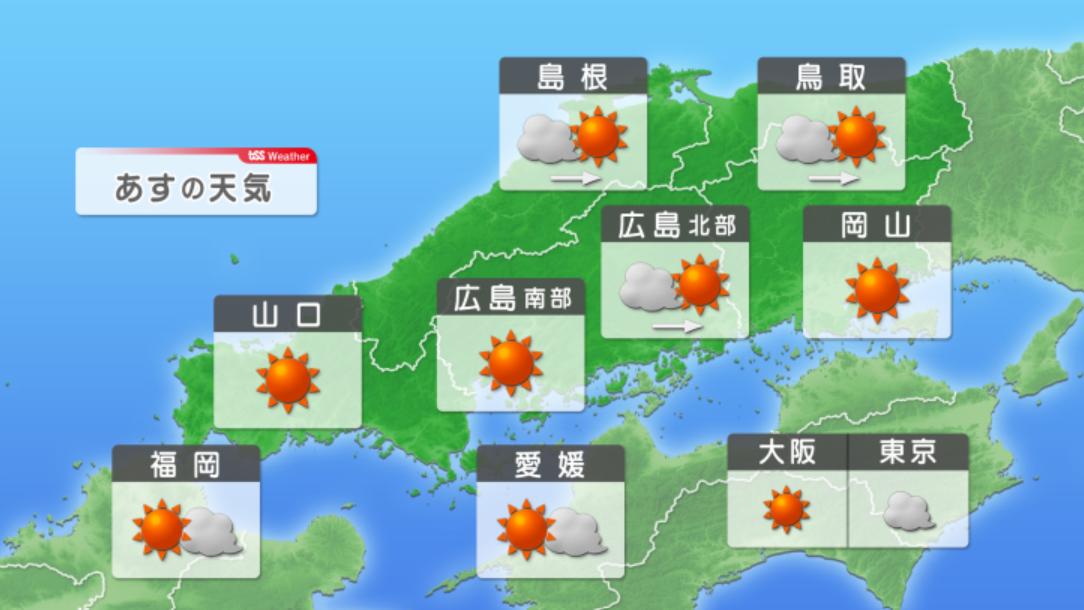 雲の影響がまだ少し続きそうですが、おおむね晴れるでしょう。山沿いや内陸部の朝は最低気温が20℃を下回りヒンヤリとした体感が戻りそうです。一方、日中は20℃台後半まで気温が上がり、半袖で過ごせる陽気でしょう。