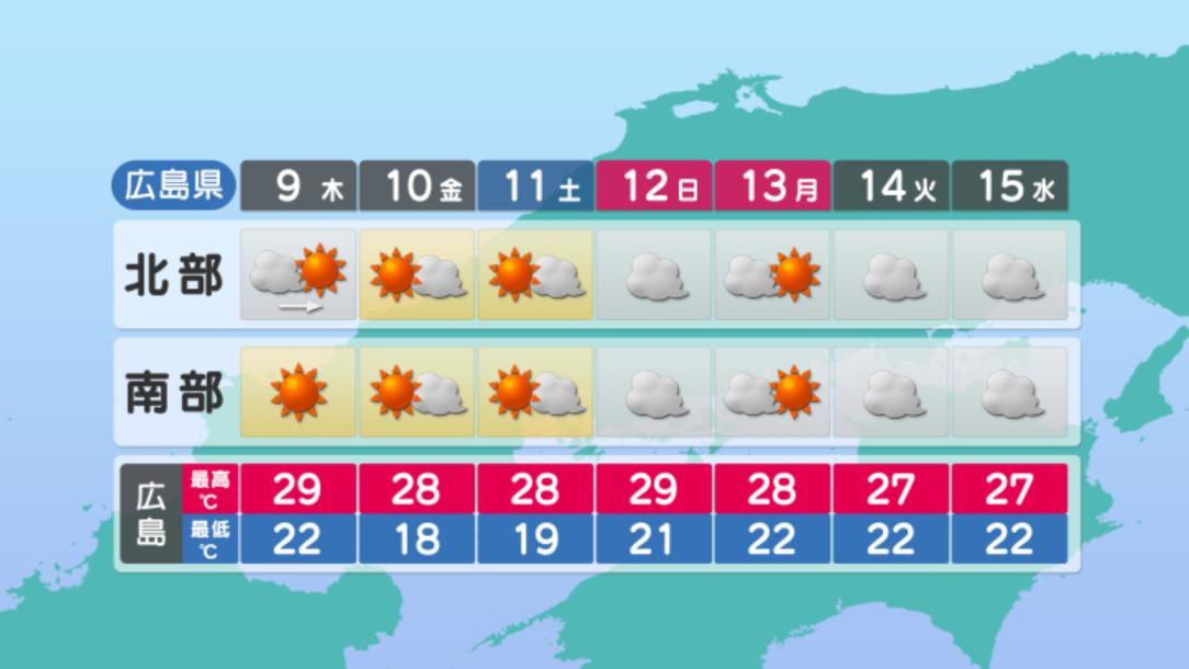 10/9(木)の広島県内は大陸から高気圧が進んで、次第に秋の空気に包まれ始めるでしょう。高気圧の縁にあたり、北寄りの風がやや強まりそうです。