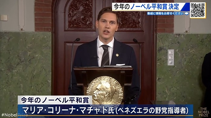 「今年のノーベル平和賞に選ばれたのはベネズエラの野党指導者マリア・コリーナ・マチャド氏です。