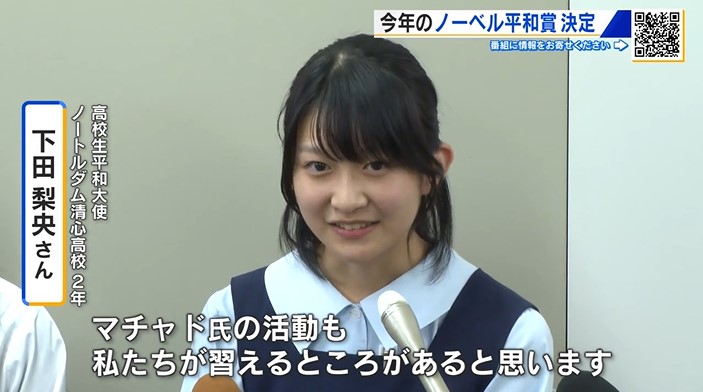 ノーベル平和賞はベネズエラの野党指導者 マチャド氏 高校生平和大使「私たちも習っていきたい」 広島