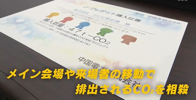 メイン会場で使用するエネルギーや来場者が移動する際に排出すると想定されるCO2を打ち消すため、中国電力が保有する森林が吸収するCO2の一部、47トン分をJクレジットとして購入しているんです。