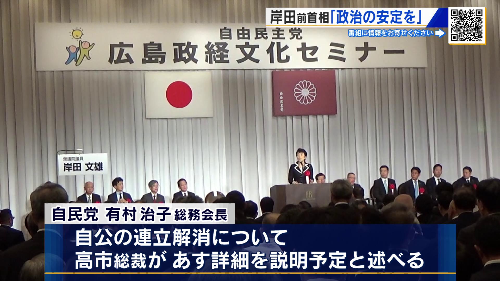 自公連立の枠組みが崩れた中、12日、地元入りしていた岸田文雄前総理は、公明党の連立離脱を念頭に安定した政権基盤を再構築すべきとの認識を示しました。