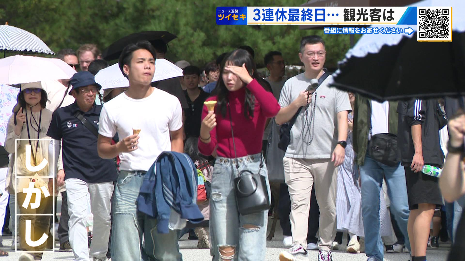 「3連休ということもあり人が多いのはもちろんだが外国人の方、やはり多いですね。団体で来ている方もいれば個人の方もいますけど、ひっきりなしに神社のほうへと向かっています…こんにちは」