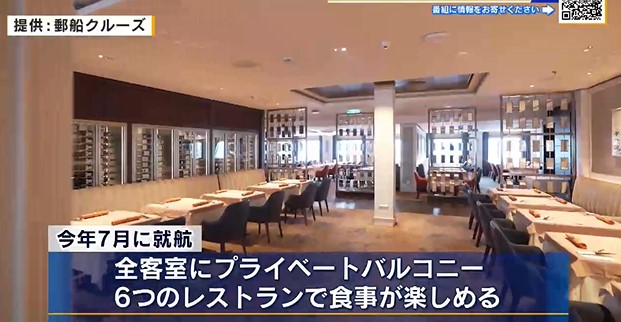 「飛鳥III」は今年7月20日に就航したばかりで全ての客室にプライベートバルコニーがあり6つのレストランで食事が楽しめます。
