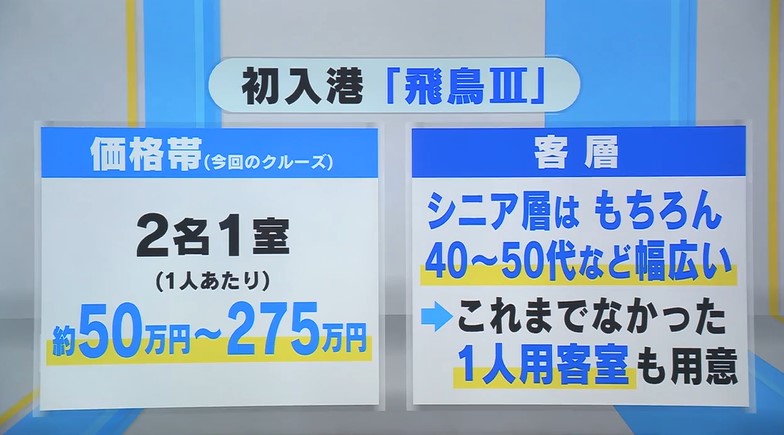 客層はシニア層はもちろん、「飛鳥III」では、これまでの飛鳥にはなかった1人用の客室も用意されていて40代から50代の現役世代など幅広く選ばれているということです。